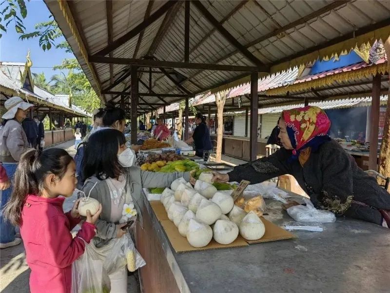穿過曼沙古寨的大門,一條擺放各類美食、手工藝品的長廊便映入眼簾,攤位上有新鮮山貨、伴手禮、烤雞、舂木瓜、炸串、檸檬汁……已然成為游人“舌尖的天堂”。曼沙古寨植被茂盛、鮮花盛開,豐收時節(jié),還可以看到村民栽種在家門口的木瓜樹、菠蘿蜜樹、芭蕉樹上掛著一串串果實,瓜果飄香令人沉醉。