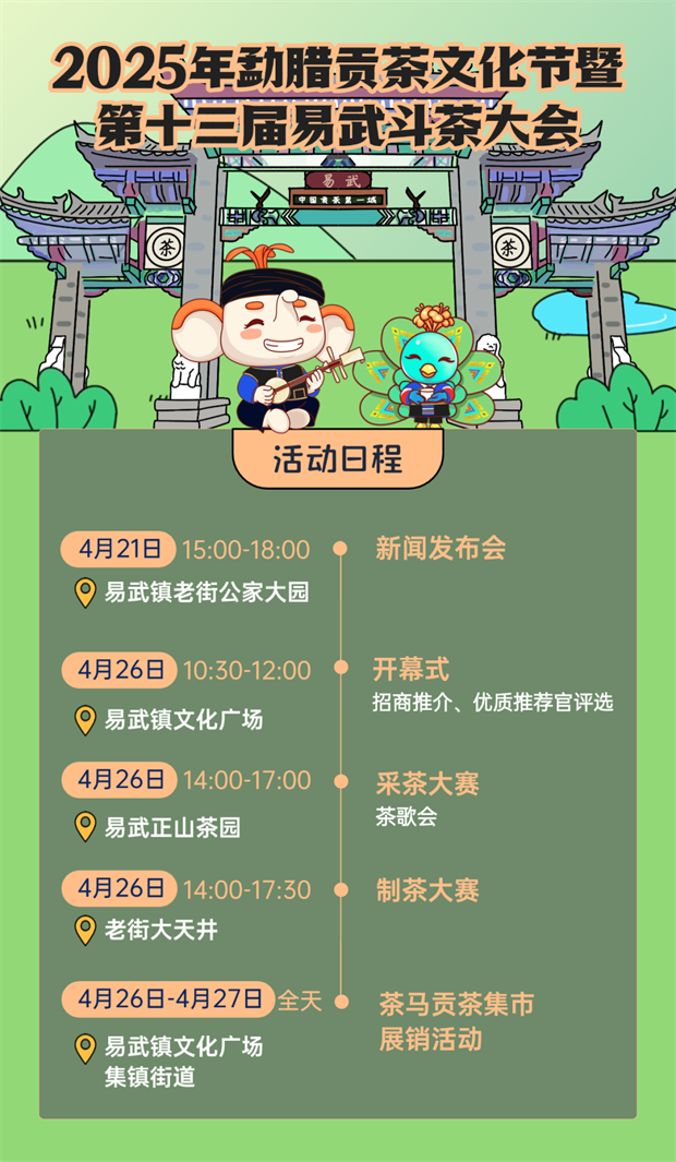 據(jù)介紹,2025年勐臘貢茶文化節(jié)暨第十三屆易武斗茶大會(huì)將于4月26日至27日在“中國(guó)貢茶第一鎮(zhèn)——易武”舉行。本次活