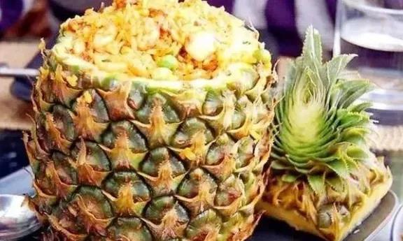 菠蘿飯看起來就很誘人,整個菠蘿很萌的樣子。其做法也很簡單,首先要將紫糯米浸泡7-8個小時,將菠蘿頂端切一個蓋,掏去菠蘿心,放入糯米,蓋上菠蘿蓋后放到甄鍋里煮,聞到香味后,即可開蓋食用。味道有點甜,而且有補血潤肺的功效哦。
