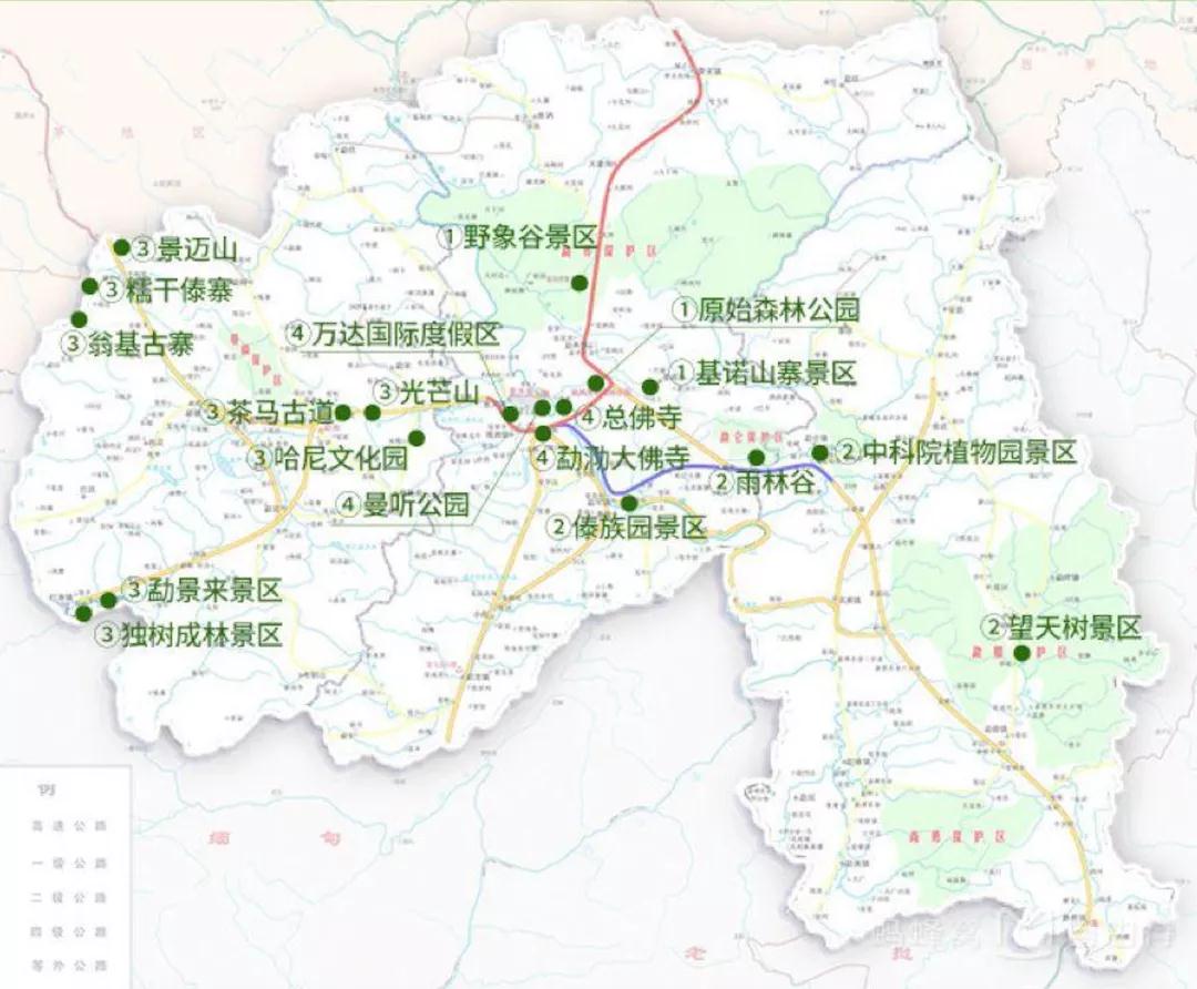 西雙版納的旅游景點相對比較分散。基本就是除了景洪(市區(qū))外,它的東西北都有景點。我從網(wǎng)上找了一張圖,大家可以看看。