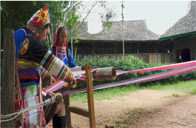 基諾族還擁有一雙靈巧的手,通?;Z族婦女都會在農閑時坐在自家的院子里,親手縫制自己的服飾。基諾族的服飾都是純手工制作,手工織出的布叫做砍刀織布,也叫彩虹布,幾乎每一個婦女都會用砍刀布制做自己的衣服,形成獨特的美。