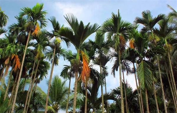檳榔樹的外貌與椰子樹相似,高干挺拔,枝葉迎風(fēng),清秀可愛。檳榔的果實(shí)可食,南方一些地方人民有咀嚼檳榔的習(xí)慣,愈嚼愈香,醇味醉入。檳榔也是一種藥材,有止瀉治痢、殺蟲去積等功能,別名“洗瘴丹”。