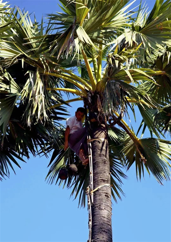 糖棕也稱為砂糖椰子,人們喜歡用小刀刻劃花序,然后花序汁就會(huì)順著刀子流向桶里,其汁液十分甜,像砂糖一般,一個(gè)花序可以產(chǎn)出4小桶甜汁液。