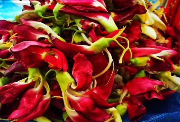 糯米的染色過程并沒有你想象的那么神秘和復雜,而色彩的秘密就藏在花朵之中。制作染液,只需將染色花在水里煮沸之后撈出花朵的殘渣,冷卻一段時間后便大功告成了。密蒙花能制作出明朗黃的染液,蝶豆花能制作出藍色染液,蘇木能制作出橙色的染液,洛神花能制作出紫色的染液,還有少見的綠色染液,也是利用黃梔子和蝶豆花一起煮沸所制成。當染液準備完成后,只需將糯米分別放入冷卻后的汁液里浸泡十余個小時,過濾之后蒸一下就可以變成七彩糯米了。