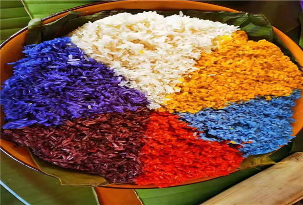 糯米飯是西雙版納傣族餐桌上必不可少的一道美食,由于西雙版納常年光照充足,土壤肥沃,讓西雙版納所產的糯米更加香糯。勤勞而又聰慧的西雙版納人民開發出了各式各樣的糯米做法,彩色糯米就是其中一種。