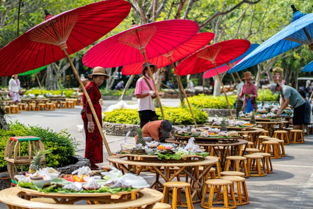 5月28日,隨著炫彩旅行社的大型旅游團(tuán)隊(duì)陸續(xù)抵達(dá),西雙版納傣族園景區(qū)迎來首個(gè)萬人規(guī)模大型旅游團(tuán)隊(duì)。景區(qū)以舉辦“長(zhǎng)街宴”活動(dòng)的最高規(guī)格來迎接遠(yuǎn)道而來的游客。“打起象腳鼓,敲響金铓鑼……”當(dāng)游客來到景區(qū),美麗的傣家“哨哆哩”(傣語:姑娘)唱起祝酒歌、跳起迎賓舞,熱情邀請(qǐng)游客參與傣族園“長(zhǎng)街宴”活動(dòng)。賓客匯聚在充滿傣族風(fēng)情的潑水大道上,歌聲、笑聲、掌聲在這里久久回蕩,場(chǎng)面蔚為壯觀。傣家烤雞、香茅草烤魚、手撕豬肉干巴、芭蕉葉蒸肉、手抓三色飯……隨著一盤盤散發(fā)著熱氣和香氣的菜肴端上桌,一條特色小吃“長(zhǎng)龍”呈現(xiàn)在眼前,讓外地游客迫不及待想要品嘗傣族園“長(zhǎng)街宴”上的美味佳肴。近年來,西雙版納傣族園景區(qū)充分發(fā)揮文化和旅游行業(yè)資源優(yōu)勢(shì),通過探索“旅游+產(chǎn)業(yè)+就業(yè)”的多種聯(lián)動(dòng)發(fā)展模式,不斷推進(jìn)周邊緊鄰傣族村寨群眾創(chuàng)業(yè)就業(yè),帶動(dòng)村內(nèi)傣家樂餐廳、特色民宿等產(chǎn)業(yè)發(fā)展,在推進(jìn)鄉(xiāng)村振興的同時(shí),讓傳統(tǒng)文化更富魅力,實(shí)現(xiàn)鄉(xiāng)村旅游效益提升,推動(dòng)產(chǎn)業(yè)鏈條延伸、融合發(fā)展,提高鄉(xiāng)村整體經(jīng)濟(jì)實(shí)力,推動(dòng)全域旅游業(yè)高質(zhì)量快速發(fā)展。